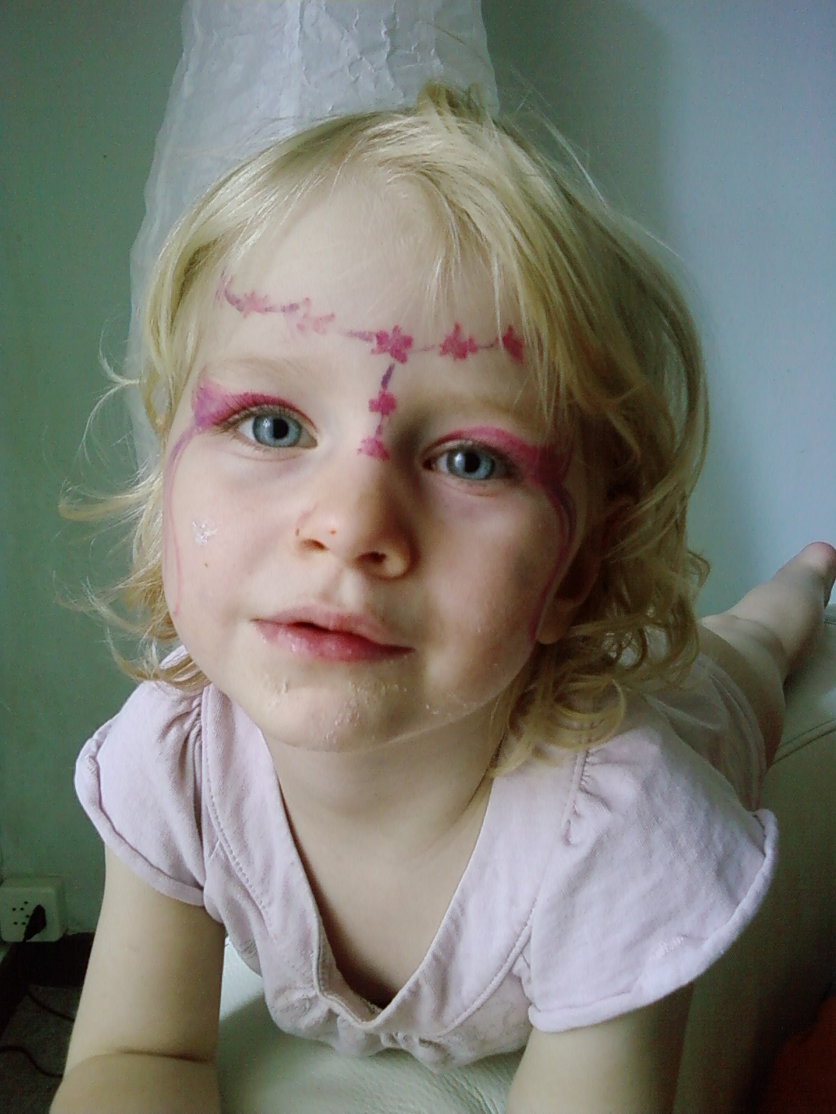 And here she is, the artist herself. Small Fish came home with face paint from preschool the other day (super cute).